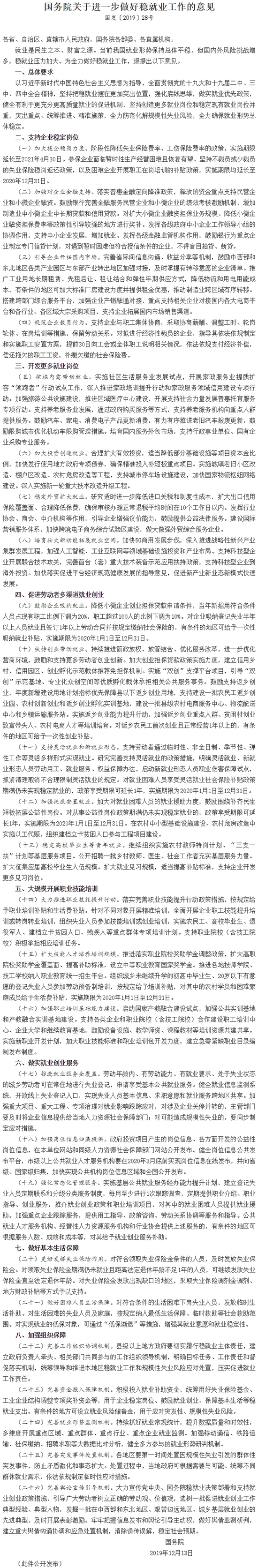 附《国务院关于进一步做好稳就业工作的意见》全文: