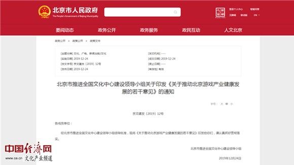 北京市推进全国文化中心建设领导小组关于印发《关于推动北京游戏产业健康发展的若干意见》的通知