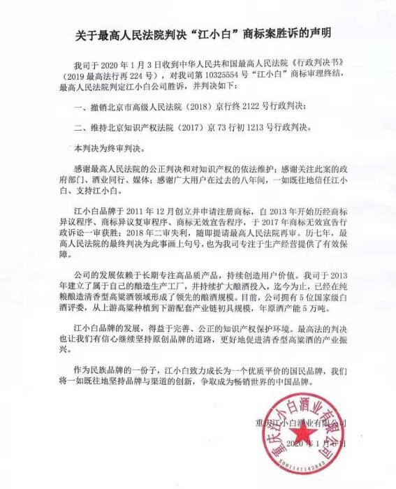 北京1月6日电(谢艺观)历经七年,江小白公司与江津酒厂的“江小白”商标之争尘埃落定。1月6日,江小白公司发布声明称,最高人民法院判定江小白公司胜诉。