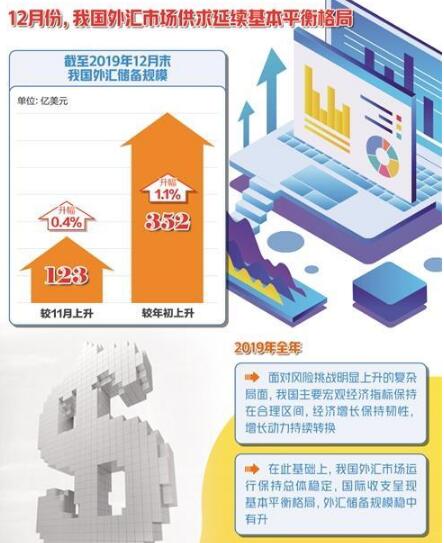 国家外汇管理局7日发布的数据显示,截至2019年12月末,我国外汇储备规模为31079亿美元,较11月上升123亿美元,升幅0.4%;较年初上升352亿美元,升幅1.1%。