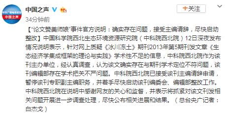 中国科学院西北生态环境资源研究院(中科院西北院)12日深夜发布情况说明表示,针对网上质疑《冰川冻土》期刊2013年第5期刊发文章《生态经济学集成框架的理论与实践》学术性不足的信息,中科院西北院作为该刊主办单位,经认真调查,认为该文确实存在与期刊学术定位不符问题,该刊编辑部存在学术把关不严问题。中科院西北院已接受该刊主编请辞申请,暂停该刊专职副主编职务,并着手尽快启动该刊编委会、编辑部整改工作。中科院西北院在说明中感谢网友的关心和监督,并表示将抓紧对该文刊发相关问题开展进一步调查处理,尽快公布相关进展和结果。(总台央广记者:白杰戈)