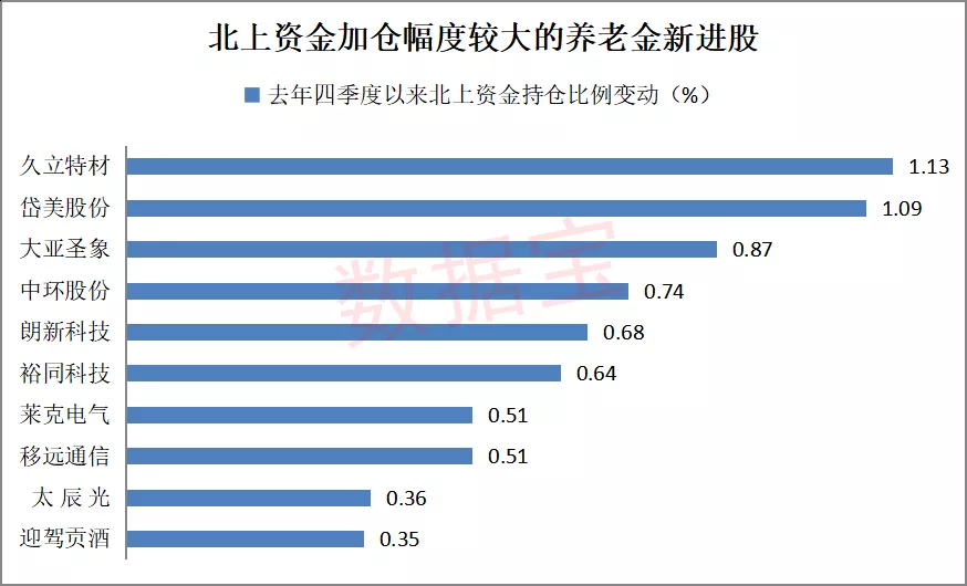 42只养老金新进股中,19股去年四季度以来获得了北上资金加仓,8股北上资金持仓占总股本比例增长超5%,久立特材、岱美股份北上资金增仓占比超过1%。