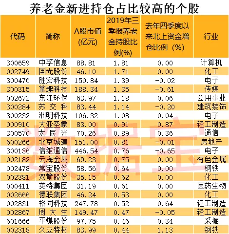 数据宝统计,2019年三季42股前十大流通股股东中首次出现养老金身影,其中,中孚信息、国光股份、胜宏科技、掌趣科技、东江环保、苏交科、洲明科技7股养老金持股占总股本比例超过1%。