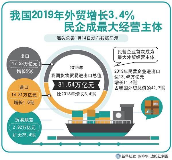 新华社北京1月14日电(记者刘红霞)海关总署14日发布数据显示,2019年我国货物贸易进出口总值31.54万亿元,比2018年增长3.4%;民营企业首次成为最大外贸经营主体。