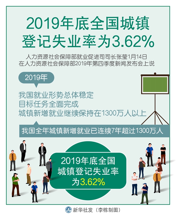 北京1月14日电(记者王优玲)人力资源社会保障部就业促进司司长张莹14日说,2019年我国就业形势总体稳定,目标任务全面完成,城镇新增就业继续保持在1300万人以上,2019年底全国城镇登记失业率为3.62%。