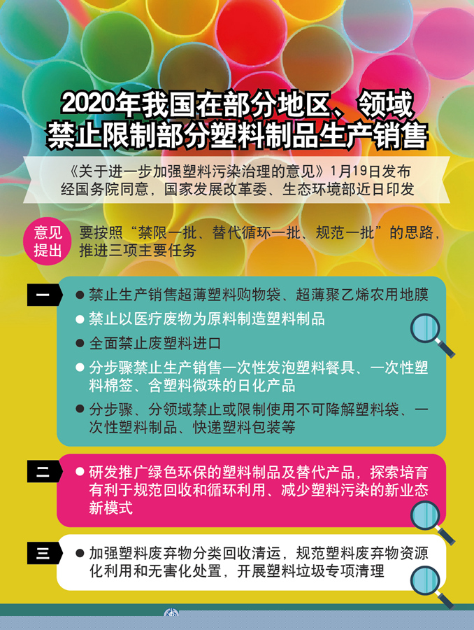 意见提出,要按照“禁限一批、替代循环一批、规范一批”的思路,推进三项主要任务。一是禁止生产销售超薄塑料购物袋、超薄聚乙烯农用地膜。禁止以医疗废物为原料制造塑料制品。全面禁止废塑料进口。分步骤禁止生产销售一次性发泡塑料餐具、一次性塑料棉签、含塑料微珠的日化产品。分步骤、分领域禁止或限制使用不可降解塑料袋、一次性塑料制品、快递塑料包装等。二是研发推广绿色环保的塑料制品及替代产品,探索培育有利于规范回收和循环利用、减少塑料污染的新业态新模式。三是加强塑料废弃物分类回收清运,规范塑料废弃物资源化利用和无害化处置,开展塑料垃圾专项清理。