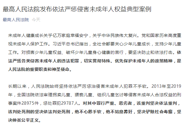 今天(18日),最高人民法院发布7件依法严惩侵害未成年人权益典型案例。最高法表示,2013年至2019年,全国法院依法审理拐卖儿童、猥亵儿童、组织儿童乞讨等侵害未成年人合法权益的刑事案件28975件,惩处罪犯29787人。对其中罪行严重、恶劣者,该重判坚决依法重判,该判处死刑的坚决依法判处死刑,绝不心慈手软,绝不姑息养奸,坚决铲除社会毒瘤,坚决伸张公平正义。
