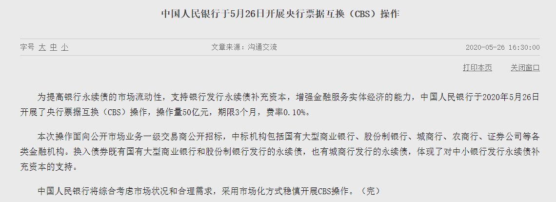 据央行网站消息,为提高银行永续债的市场流动性,支持银行发行永续债补充资本,增强金融服务实体经济的能力,中国人民银行于2020年5月26日开展了央行票据互换(CBS)操作,操作量50亿元,期限3个月,费率0.10%。