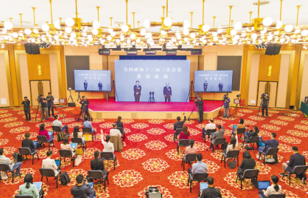 5月21日,在北京人民大会堂新闻发布厅举行全国政协十三届三次会议第一场“委员通道”采访活动。今年的“委员通道”采访活动采取网络视频的方式举行,政协委员在人民大会堂现场“隔屏”回答记者的提问。