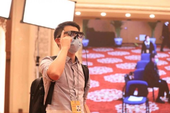 人民日报新媒体记者采用AR采访眼镜现场采访拍摄。