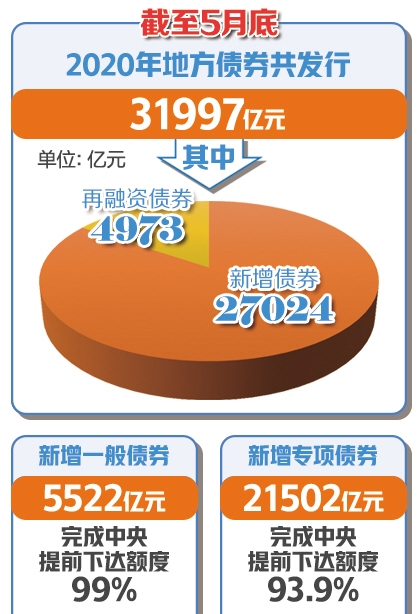 财政部3日发布的统计数据显示,5月份地方政府债券发行13025亿元,创地方债券单月发行量新高。截至5月底,2020年地方债券共发行31997亿元,其中新增债券27024亿元,再融资债券4973亿元。