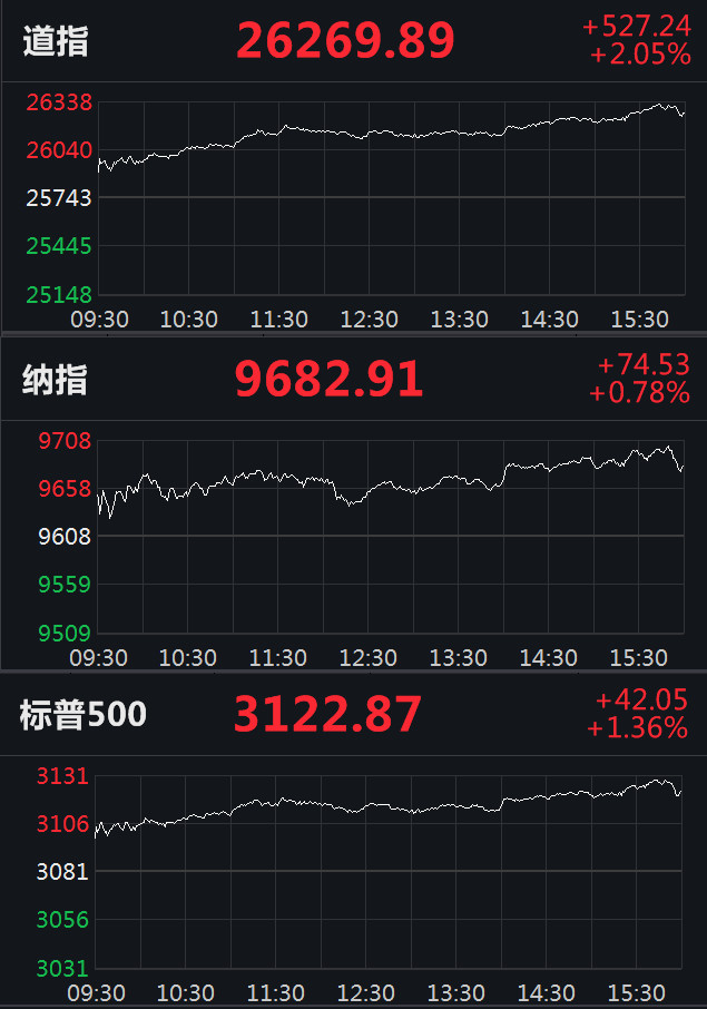 截至收盘,道指涨527.24点,涨幅2.05%,报26269.89点;纳指涨74.53点,涨幅0.78%,报9682.91点;标普500指数涨42.05点,涨幅1.36%,报3122.87点。