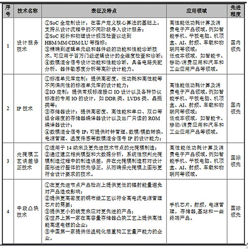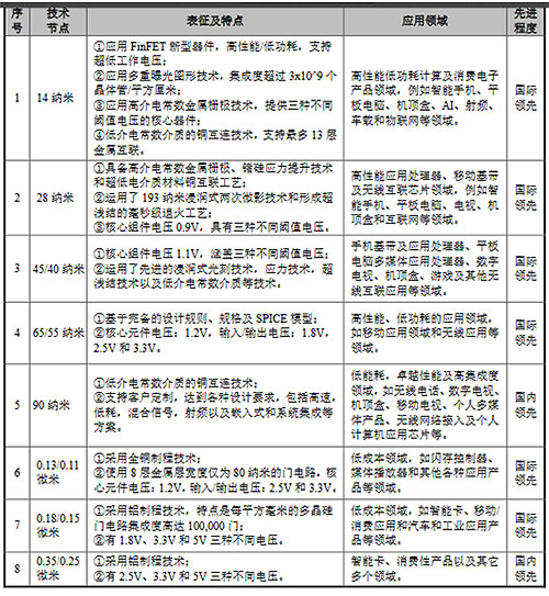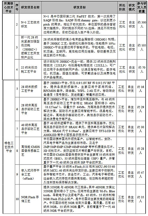 招股说明书显示,中芯国际成功开发了0.35微米至14纳米的多种技术节点,主要应用于逻辑工艺技术平台与特色工艺技术平台,其核心技术情况如下: