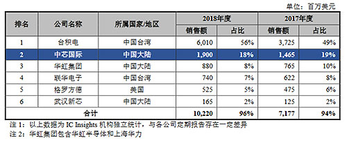 根据IC Insights公布的2018年纯晶圆代工行业中国市场销售额排名,中芯国际占中国纯晶圆代工市场份额的18%,在中国大陆企业中排名第一,具体如下表所示: