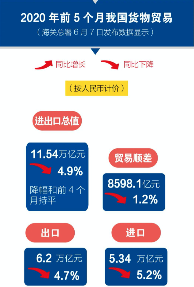 今年前5个月,我国货物贸易进出口总值11.54万亿元人民币,比去年同期下降4.9%,降幅和前4个月持平。其中,出口6.2万亿元,下降4.7%;进口5.34万亿元,下降5.2%;贸易顺差8598.1亿元,减少1.2%。
