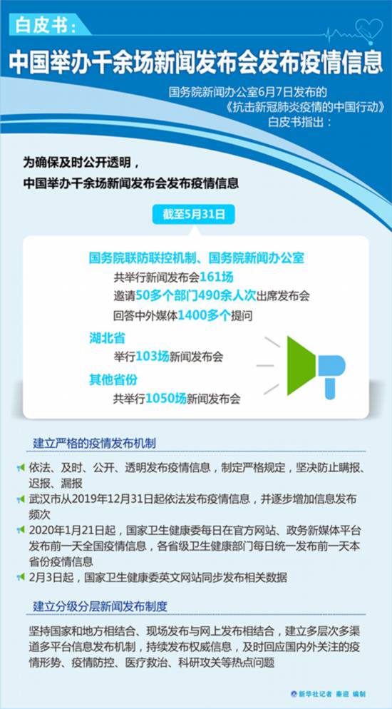 北京6月7日电(记者王秉阳)国务院新闻办公室7日发布的《抗击新冠肺炎疫情的中国行动》白皮书指出,为确保及时公开透明,中国举办千余场新闻发布会发布疫情信息。