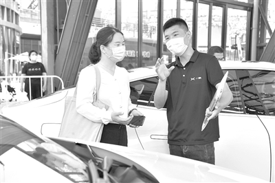6月6日,在北京华熙LIVE·五棵松商业街区举办的“北京消费季之悦动海淀”活动现场,工作人员(右)向市民介绍一款汽车的配置。当日,北京消费季正式开启,进一步推动北京各行业复商复市,加快实现消费回暖。记者 任超 摄