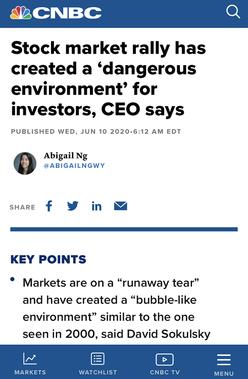 11日的大跌之前,美国股市已从3月中旬的低点上涨40%以上,纳斯达克指数自年初以来更是上涨超过10%。此轮涨势正值新冠疫情引发经济衰退、美国警察暴力执法引发骚乱之际,引发外界高度关注。