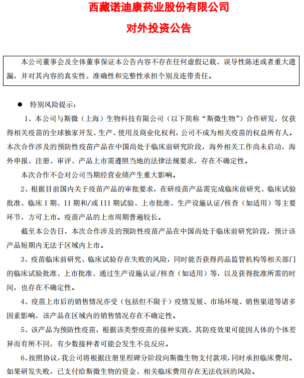 西藏药业同时提醒,本次合作涉及的预防性疫苗产品在中国尚处于临床前研究阶段,海外相关工作尚未启动,海外申报、注册、审评、产品上市需遵照当地的法律法规要求,存在不确定性。本次合作不会对公司当期经营业绩产生重大影响。