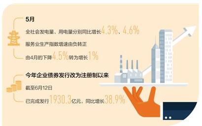 5月,全社会发电量、用电量分别同比增长4.3%、4.6%。我国部分工业实物量指标明显回升,生产供给持续回升,内需复苏较为明显,物价指标总体保持平稳。主要经济指标持续改善,经济运行秩序重回正轨。
