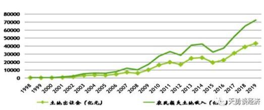 从世界许多国家土地交易收入看,政府一般征收交易额20%到40%不等的税收,其余留给土地所有者。中国的城市土地为国有,农村和城郊土地为农民集体所有者。改革开放以来到2019年,城市县城、水利交通、工厂矿山等建设,国有从农村和城郊集体征用转移了2亿亩左右的土地,如果1亩地价格就是100万元,现在就是200万亿元的资产。其中出让的土地规模为7110万亩,地方政府累积收取了出让金503468亿元,即使征收40%的税收,农民集体也应当得到302081亿元。但是,征地补偿农民得到的部分,不到出让金总额的5%。在地方行政寡头垄断的土地市场上,土地价格年均复合增长率17%,全国平均每亩土地出让价从1998年的6.6万元上涨到2019年的193万元。