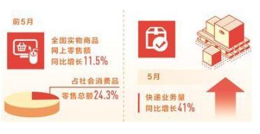 新冠肺炎疫情发生后,线下消费受到影响,线上零售迅速补位。国家统计局发布的数据显示:1—5月份,全国实物商品网上零售额同比增长11.5%,占社会消费品零售总额的比重为24.3%。国家邮政局发布的数据显示:5月份快递业务量同比增长41%,业务收入同比增长25%。直播带货、线上拼团、门店到家……随着新业态、新模式加速创新,线上消费活力迸发,实物商品网上零售对消费品市场增长贡献率继续提高,消费者得到了更多实惠和便利。
