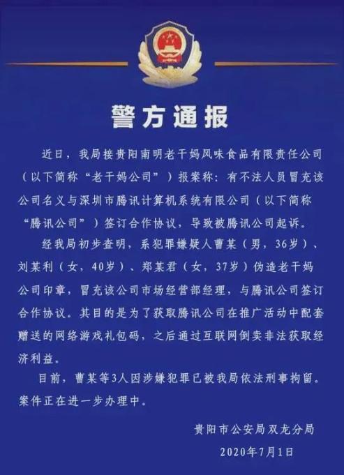 值得关注的是,据贵阳市公安局双龙分局初步查明,犯罪嫌疑人曹某、刘某利、郑某君伪造老干妈公司印章,冒充该公司市场经营部经理,与腾讯公司签订合作协议,其目的是为了获取腾讯公司在推广活动中配套赠送的网络游戏礼包码,之后通过互联网倒卖非法获取经济利益。