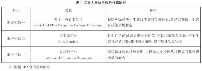 欧洲大学协会通过三个下属服务机构为欧洲博士生教育发展提供全方位的智库服务。分别是博士生教育委员会、方案制定处、机构评估处,三个下属服务机构的具体职能见表1。