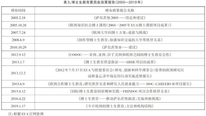 欧洲大学协会组织广大成员院校围绕事关欧洲博士生教育全局和长远问题开展研讨活动,在把握世界博士生教育发展大势的基础上研判世界博士生教育新方向。政策制定工作主要通过博士生教育委员会开展,该委员会于2008年启动,以响应人们对欧洲博士生教育和研究培训的日益增长的兴趣。目前,该委员会覆盖30多个国家,汇集了来自230多所大学的学术领导者和专业人士,负责授予博士学位和从事博士生教育和研究培训相关问题的工作。博士生教育委员会自成立之日起针对博士生教育这一领域共颁布了12份政策报告,主题涉及博士生教育的方方面面,为欧洲的博士生教育改革以及政策研究提供准确、前瞻、及时的建议(见表3)。