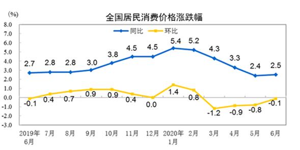 2020年6月份,全国居民消费价格同比上涨2.5%。其中,城市上涨2.2%,农村上涨3.2%;食品价格上涨11.1%,非食品价格上涨0.3%;消费品价格上涨3.5%,服务价格上涨0.7%。上半年,全国居民消费价格比去年同期上涨3.8%。