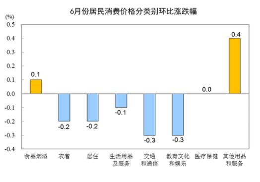 6月份,全国居民消费价格环比下降0.1%。其中,城市下降0.1%,农村持平;食品价格上涨0.2%,非食品价格下降0.1%;消费品价格持平,服务价格下降0.1%。