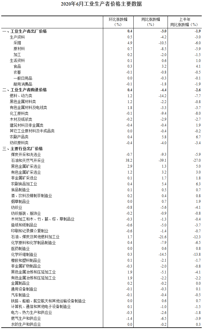 7月9日,据国家统计局网站,2020年6月份,全国工业生产者出厂价格同比下降3.0%,环比上涨0.4%;工业生产者购进价格同比下降4.4%,环比上涨0.4%。上半年,工业生产者出厂价格比去年同期下降1.9%,工业生产者购进价格下降2.6%。