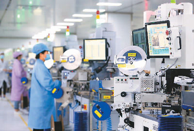 山东省青岛泰睿思微电子有限公司是一家从事集成电路芯片、电子元器件封装测试的科技型企业。今年以来,企业通过采用新技术、新工艺、新设备、新材料增强企业拓展市场能力,目前订单充足、产销两旺。图为公司工人在芯片测试生产线上检验产品质量。梁孝鹏摄(人民视觉)