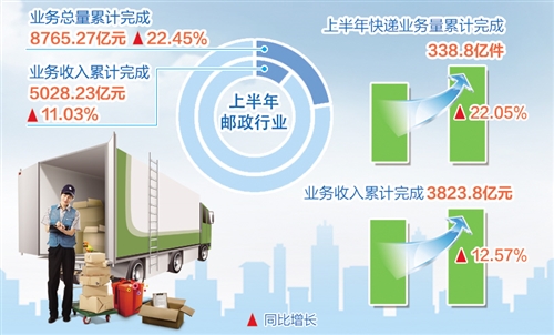 国家邮政局统计数据显示,上半年,邮政快递业逐渐摆脱新冠肺炎疫情影响逆势上扬,主要经济指标超过去年同期水平。1月至6月,邮政行业业务总量累计完成8765.27亿元,同比增长22.45%;业务收入(不包括邮政储蓄银行直接营业收入)累计完成5028.23亿元,增长11.03%。其中,快递业务量完成338.8亿件,增长22.05%,超过2016年全年(312.8亿件);快递业务收入完成3823.8亿元,增长12.57%。