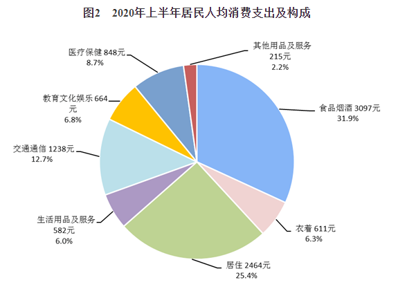 上半年,全国居民人均食品烟酒消费支出3097元,增长5.0%,占人均消费支出的比重为31.9%;人均衣着消费支出611元,下降16.4%,占人均消费支出的比重为6.3%;人均居住消费支出2464元,增长3.1%,占人均消费支出的比重为25.4%;人均生活用品及服务消费支出582元,下降6.4%,占人均消费支出的比重为6.0%;人均交通通信消费支出1238元,下降10.7%,占人均消费支出的比重为12.7%;人均教育文化娱乐消费支出664元,下降35.7%,占人均消费支出的比重为6.8%;人均医疗保健消费支出848元,下降9.9%,占人均消费支出的比重为8.7%;人均其他用品及服务消费支出215元,下降22.6%,占人均消费支出的比重为2.2%。