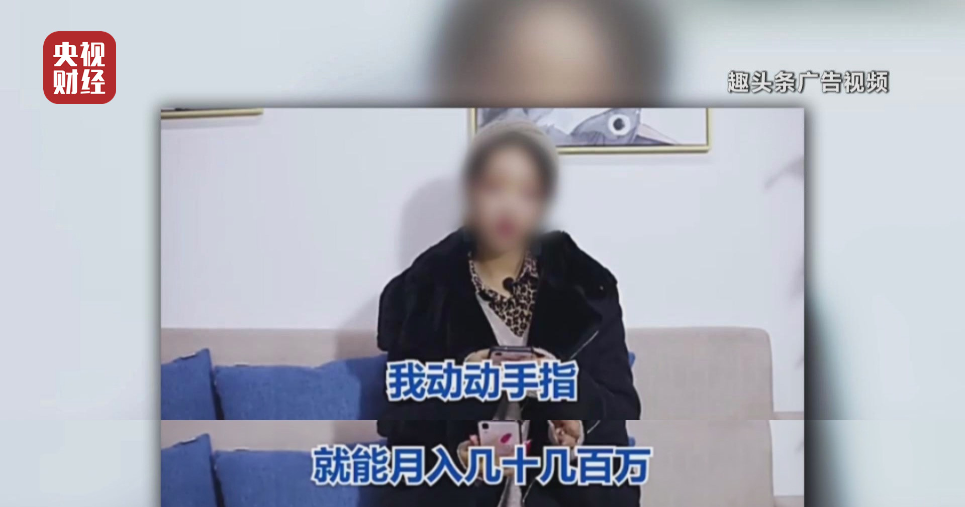 这些令人怦然心动的广告,在趣头条的推荐、视频、地域、养生、励志等多个专题板块出现,在一个板块的连续20条资讯里,这样的广告就高达5条。这些广告无一例外地宣称如何轻松赚钱,五分钟进账五百块,月入几百万等,极尽夸张功能。
