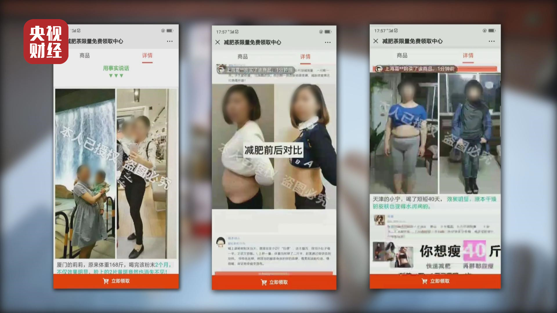 广告页面里还不时弹出某地区某人在几分钟前已购买了这款减肥产品,优化师说,这些其实都是假的,提前编好的。优化师还告诉记者,很多减肥产品都采用这样的模式,在趣头条上收到很好的广告效果,可以直接使用。