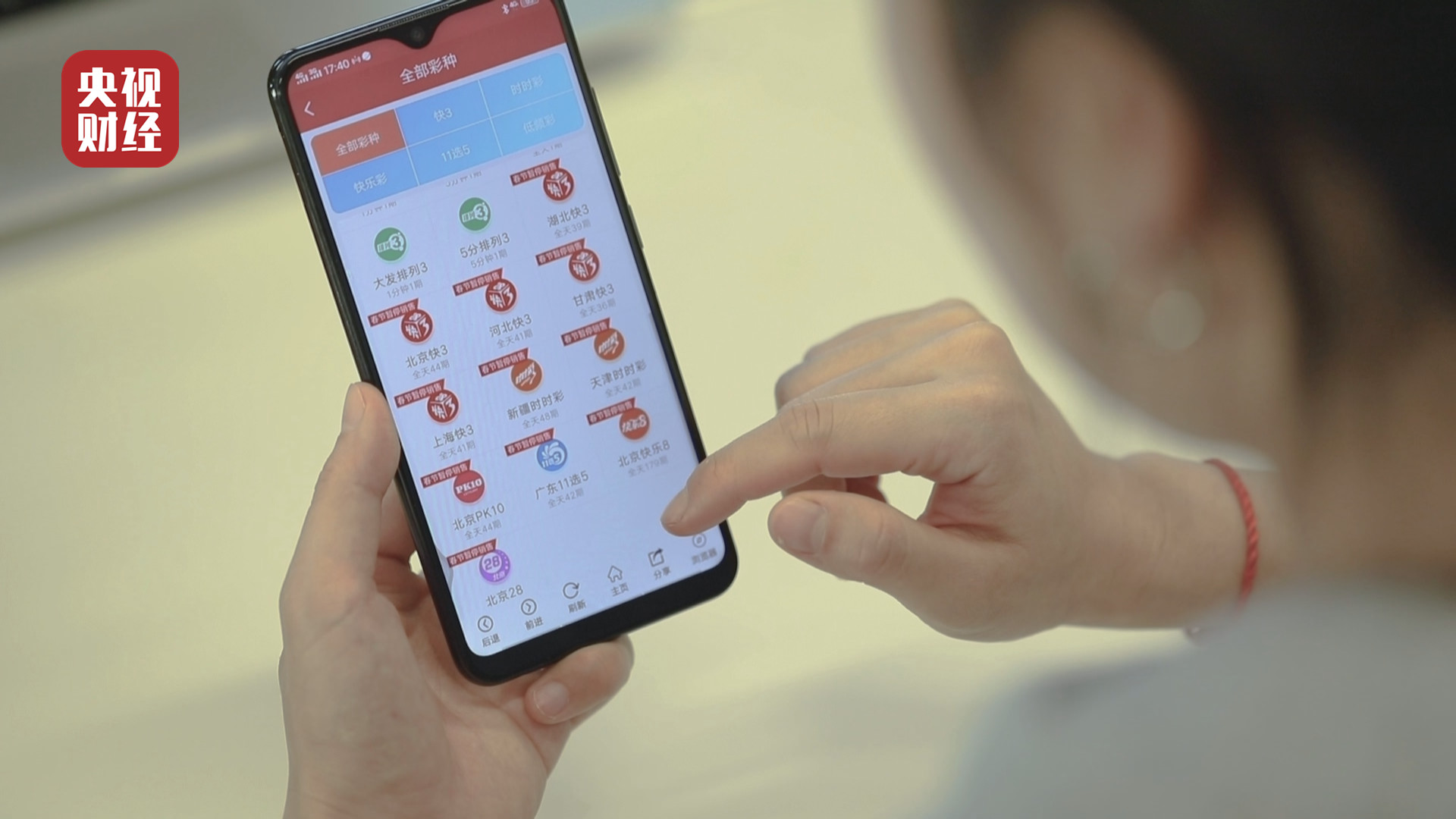记者添加这个微信号,对方发来一个网址,记者打开这个网址发现,里面有快3、幸运飞艇、香港六合彩、大发六合彩等43项彩票、6项棋牌游戏、甚至还有现场购买彩票的直播。