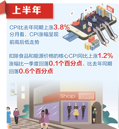 CPI涨幅呈回落态势。上半年,CPI比去年同期上涨3.8%。分月看,CPI涨幅呈现前高后低走势。3月份开始,CPI环比连续4个月下降,同比涨幅也由3月份的4.3%回落到6月份的2.5%,重回“2时代”。