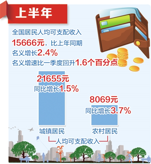 上半年,全国居民人均可支配收入15666元,比上年同期名义增长2.4%,名义增速比一季度回升1.6个百分点。扣除价格因素,实际下降1.3%,实际降幅比一季度收窄2.6个百分点。