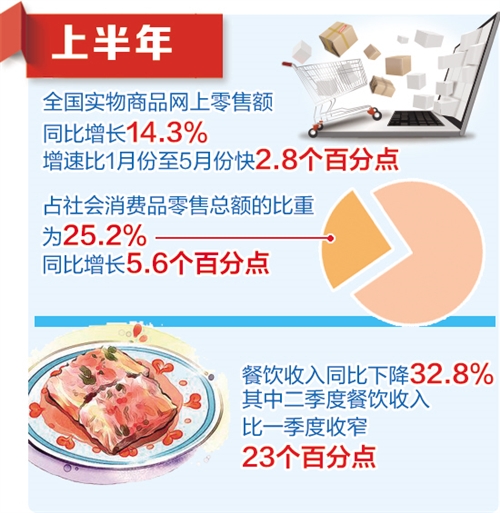 上半年,全国实物商品网上零售额同比增长14.3%,增速比1月份至5月份加快2.8个百分点;实物商品网上零售额占社会消费品零售总额比重为25.2%,同比提高5.6个百分点。