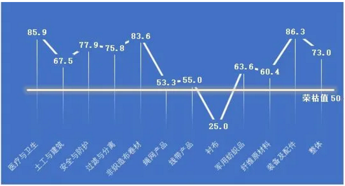 根据国家统计局数据,2020年1~5月产业用纺织品行业工业增加值增长50.7%。根据协会对224家会员企业的调研,上半年行业的景气指数为73.0,处于较高的景气区间。