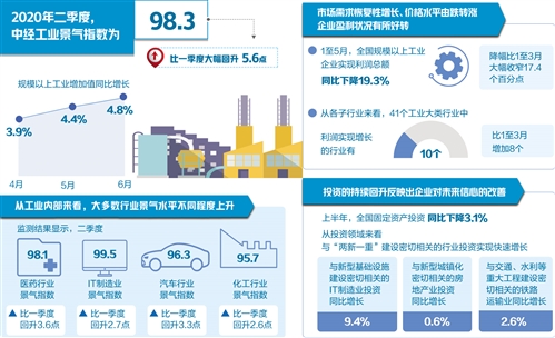今年二季度,面对新冠肺炎疫情带来的严峻考验和复杂多变的国际环境,我国统筹推进疫情防控与经济社会发展,加大“六稳”工作力度,全面落实“六保”任务,在全球范围内率先控制住疫情,率先实现经济正增长,GDP同比增长3.2%,而一季度为同比下降6.8%。在此背景下,前期被疫情抑制的市场需求逐步释放,疫情防控进一步催生新的市场需求,海外疫情蔓延也增加了对我国出口产品需求,加之对冲疫情影响的各项政策措施落地显效,工业供应链产业链逐步修复,生产销售逐步好转,盈利状况有所改善,工业景气明显提升,表现出良好的韧性和潜力。