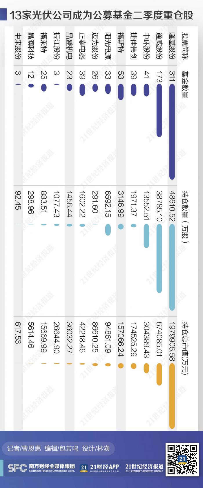 根据21世纪经济报道记者的统计,今年二季度,13只A股光伏公司成为基金重仓股,均为硅片、电池、组件、辅料、光伏设备等制造端的龙头企业。这其中,持仓市值超过10亿元的公司共计5家,分别为隆基股份、通威股份、中环股份、捷佳伟创和福斯特,持仓市值分别为197.99亿元、67.41亿元、30.44亿元、17.45亿元和15.71亿元。