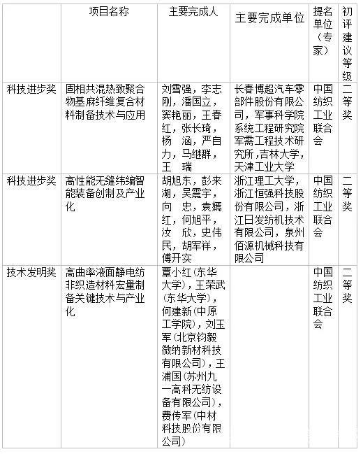 8月3日,国家科学技术奖励工作办公室发布公告,公布2020年度国家科学技术奖初评结果。其中3个纺织项目通过初评,建议等级为2020年度国家科技进步奖二等奖(通用项目)的项目2项,分别为“固相共混热致聚合物基麻纤维复合材料制备技术与应用”和“高性能无缝纬编智能装备创制及产业化”;建议等级为2020年度国家技术发明奖二等奖(通用项目)的项目1项,“高曲率液面静电纺非织造材料宏量制备关键技术与产业化”。