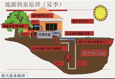 “既省电节能,又恒温恒湿,其秘诀在于大楼采用了地源热泵系统。”江苏省水文地质工程地质勘察院综合办主任许永斌介绍,“地源热泵通过输入少量的高品位能源电能,实现低温热能向高温热能的转移。简单来说,就是在冬季把地表土壤中的热量‘取’出来,用于提高供热循环水的温度,向室内供给热量;夏季则把室内的多余热量‘取’出来,‘排放’到地下,以达到房间的制冷效果。”
