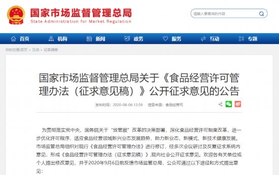 8月6日,国家市场监督管理总局发布公告,对《食品经营许可管理办法(征求意见稿)》公开征求意见。