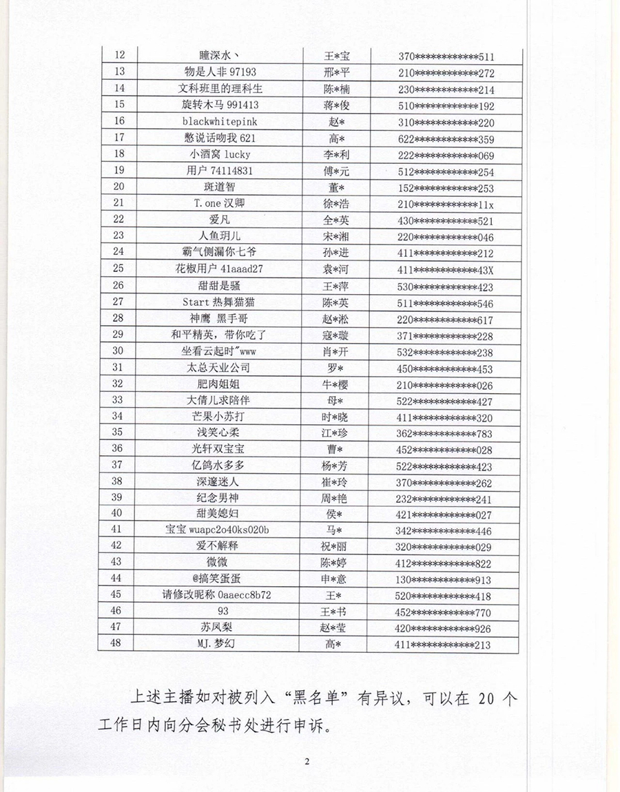 根据《互联网文化管理暂行规定》《网络表演经营活动管理办法》《互联网直播服务管理规定》等相关法律法规,按照《网络表演(直播)行业主播“黑名单”管理制度》《黑名单认定工作流程》规定,中国演出行业协会网络表演(直播)分会现向社会公布第六批主播黑名单,被列入黑名单的主播将在行业内禁止注册和直播,封禁期限5年。(总台央视记者 曹岩)