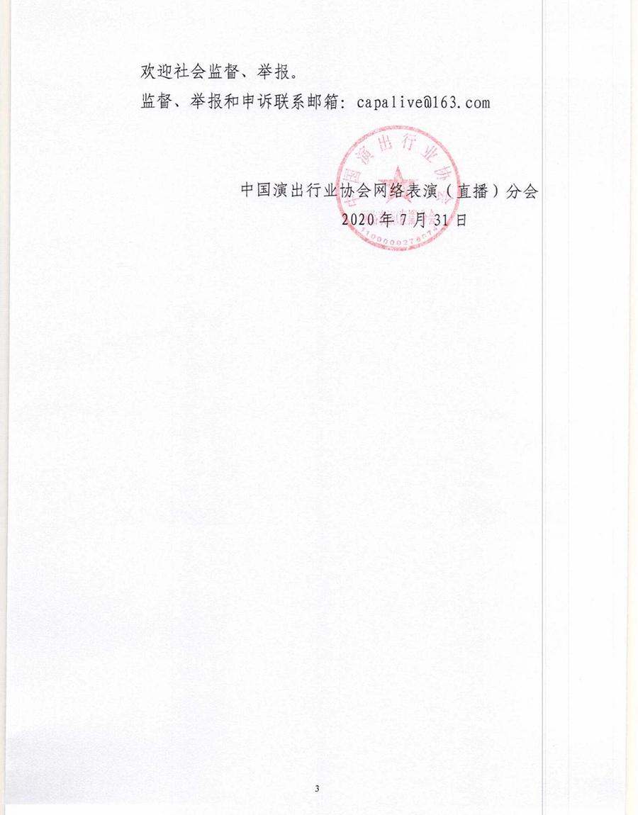 中国演出行业协会网络表演(直播)分会8月9日发布: