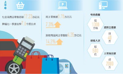 “上半年,我国消费市场也有不少亮点。”赵萍认为,线上消费快速增长,是上半年消费的最大亮点。1—6月全国网上零售额5.15万亿元,同比增长7.3%,不仅增速为正,而且比1—5月又加快了2.8个百分点。特别是实物商品网上零售额实现4.35万亿元,同比增长14.3%,占社会消费品零售总额的比重达25.2%,比1—5月提高0.9个百分点。